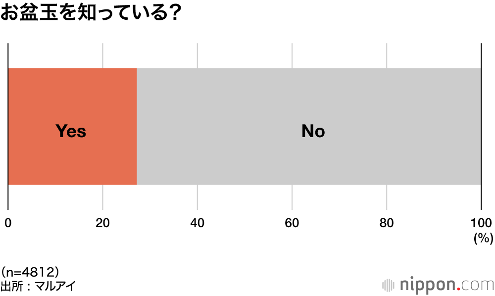 紙製品メーカーのマルアイ(山梨県市川美郷町)が20代以上の男女4812人を対象とした調査で、「お盆玉を知っているか」聞いたところ、「知っている」27.2%、「知らない」72.8%だった。年代別の大きなばらつきはなかったが、「知っている」と回答したうちの55.5%が女性で、男性よりも認知度が高かった。
