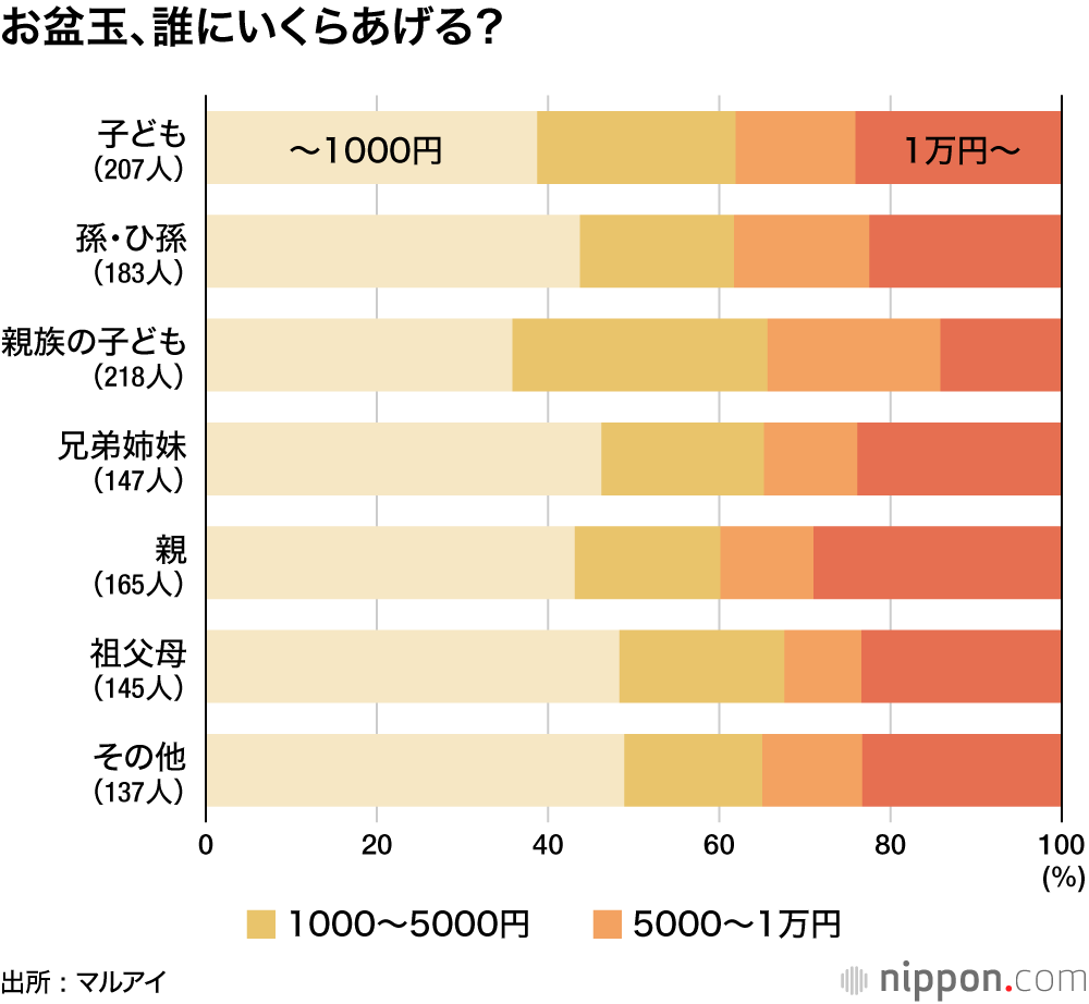 金額は1000円までのちょっとしたお小遣い感覚の人が多いが、「親族の子ども」以外に対しては、「1万円以上」あげる人が2割を超えた。中でも「親」は29.1%で最多だった。「お盆玉」には「子ども」中心の「お年玉」とは違った側面もあるようだ。