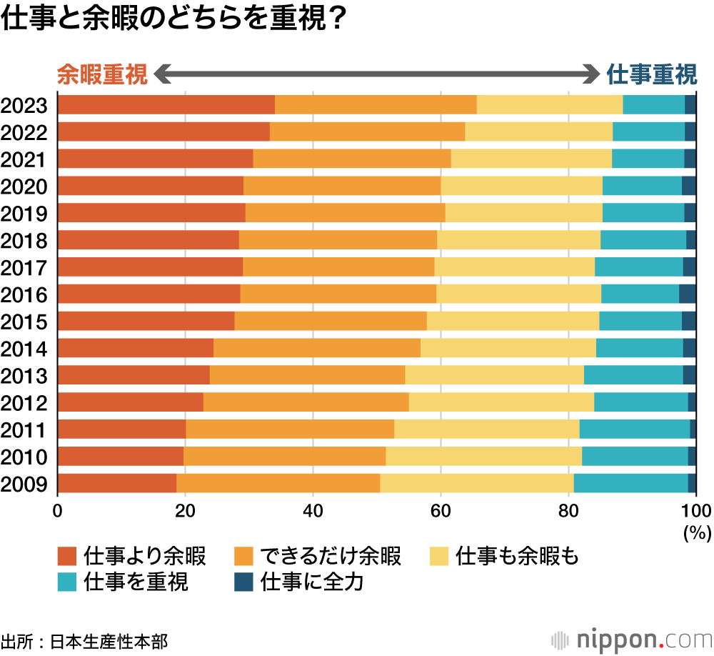 仕事と余暇のどちらに重きを置いているかを聞いた設問で、「仕事よりも余暇の中に生きがいを求める」(34.1%)と「仕事は要領よく片付けて、できるだけ余暇を楽しむ」(31.6%)を合わせた「余暇重視派」は65.7%。比較可能な09年以降で過去最高となった。「仕事にも余暇にも同じぐらい力をいれる」は22.9%、「余暇も時には楽しむが、仕事の方に力を注ぐ」は9.7%だった。