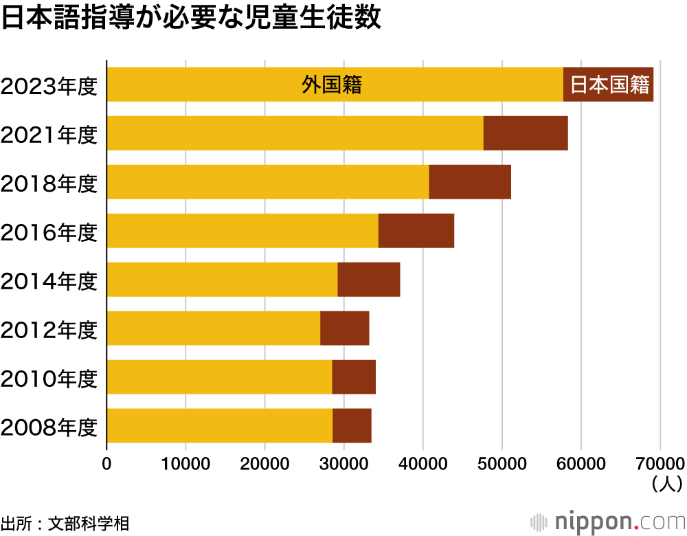 外国生まれであったり、両親が日本語ネイティブでないなどの理由で日本語指導が必要な小中高生は2023年度時点で約6万9123人だった。調査は文部科学省が隔年で実施しており、21年度の前回調査5万8307人からは18.6%増加、08度年の3万3470人からは倍増以上している。