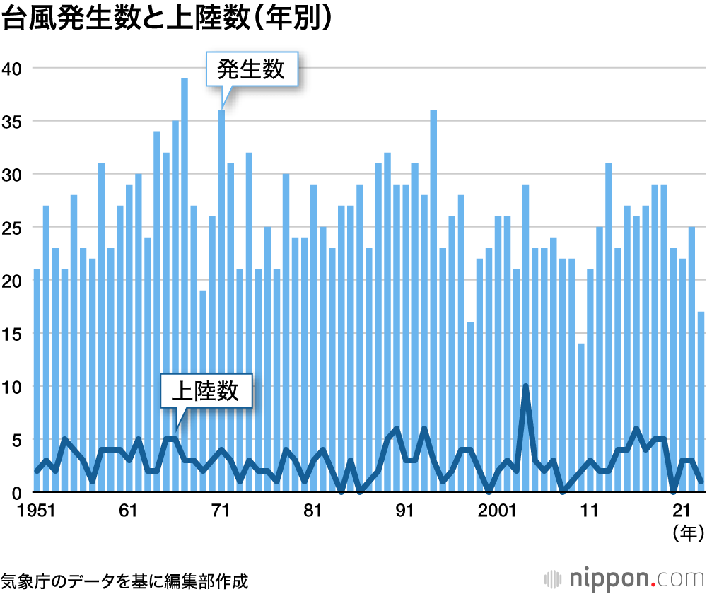 台風の発生数は年によってばらつきがあるが、1951~2023年までを平均すると年26回。そのうち、日本に上陸するのは平均で年3回程度だ。