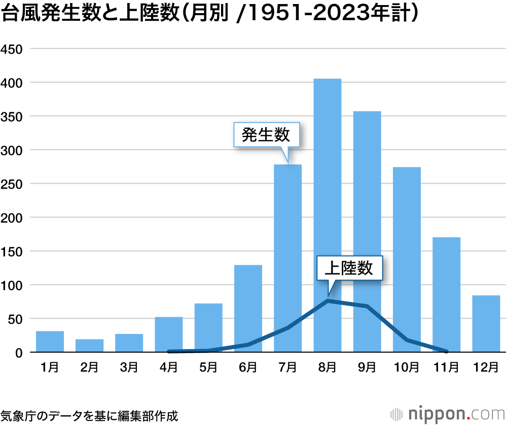 台風は暖かい海面から供給された水蒸気が凝結して雲粒になるときに放出される熱をエネルギーとして発達する。このため、発生数、上陸数ともに水温が高い海域が増える7~10月に集中し、この時期に大雨による水害や土砂崩れなどが発生することが多い。