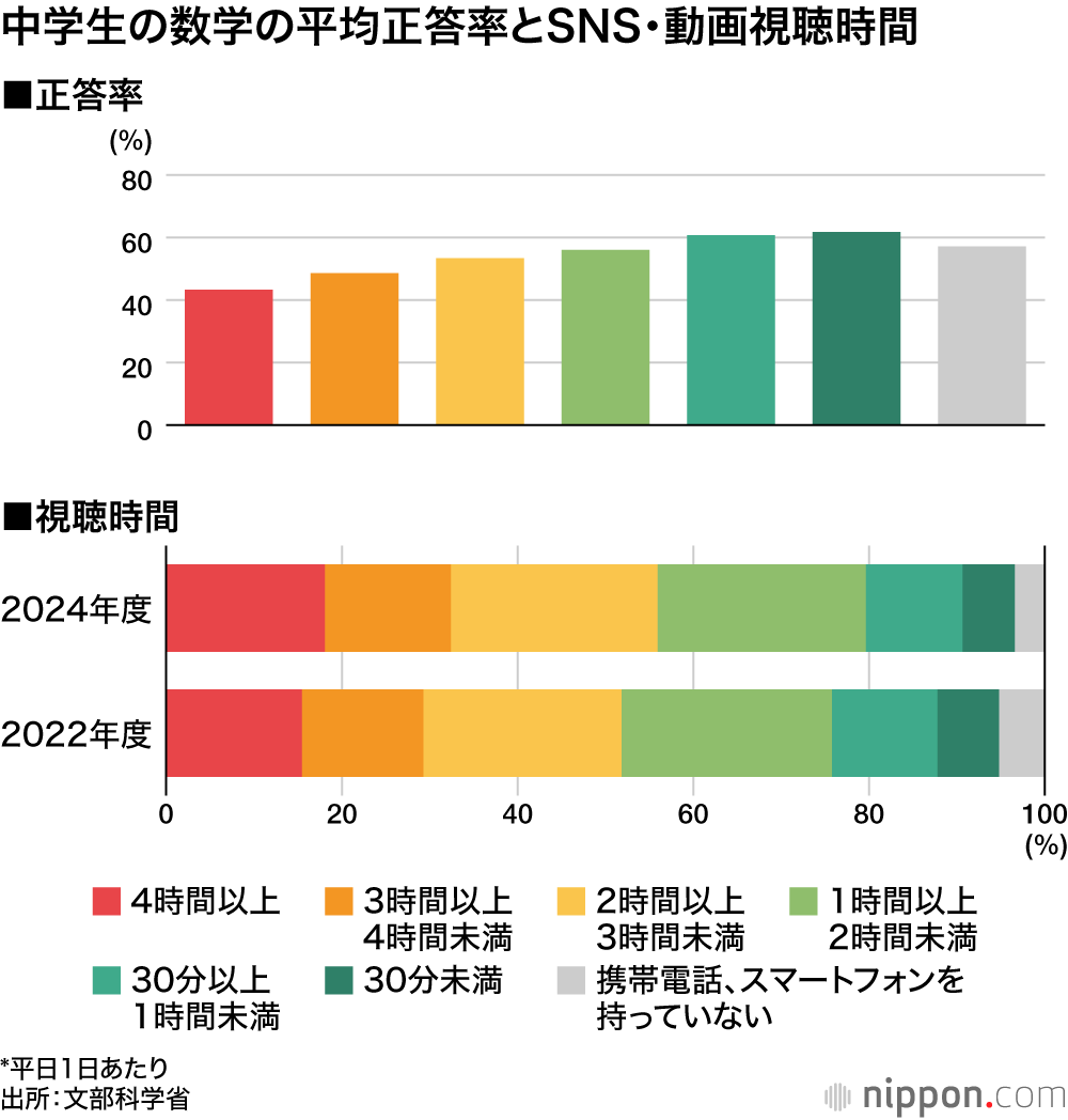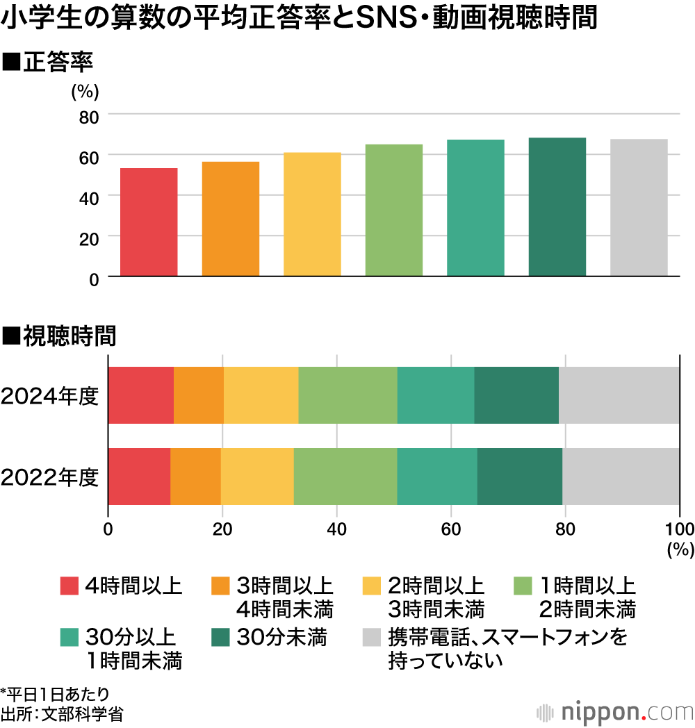 小中学生の交流サイト(SNS)や動画の視聴時間が長くなっている。全国学力テストでは、長時間になるほど正答率が低下する傾向がみられた。