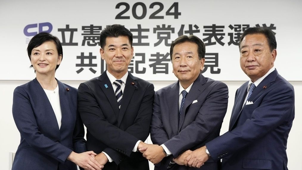 バナー写真:立憲民主党代表選に立候補し、撮影に応じる(左から)吉田晴美、泉健太、枝野幸男、野田佳彦の各氏=7日午前、東京・永田町の立憲民主党本部(共同)