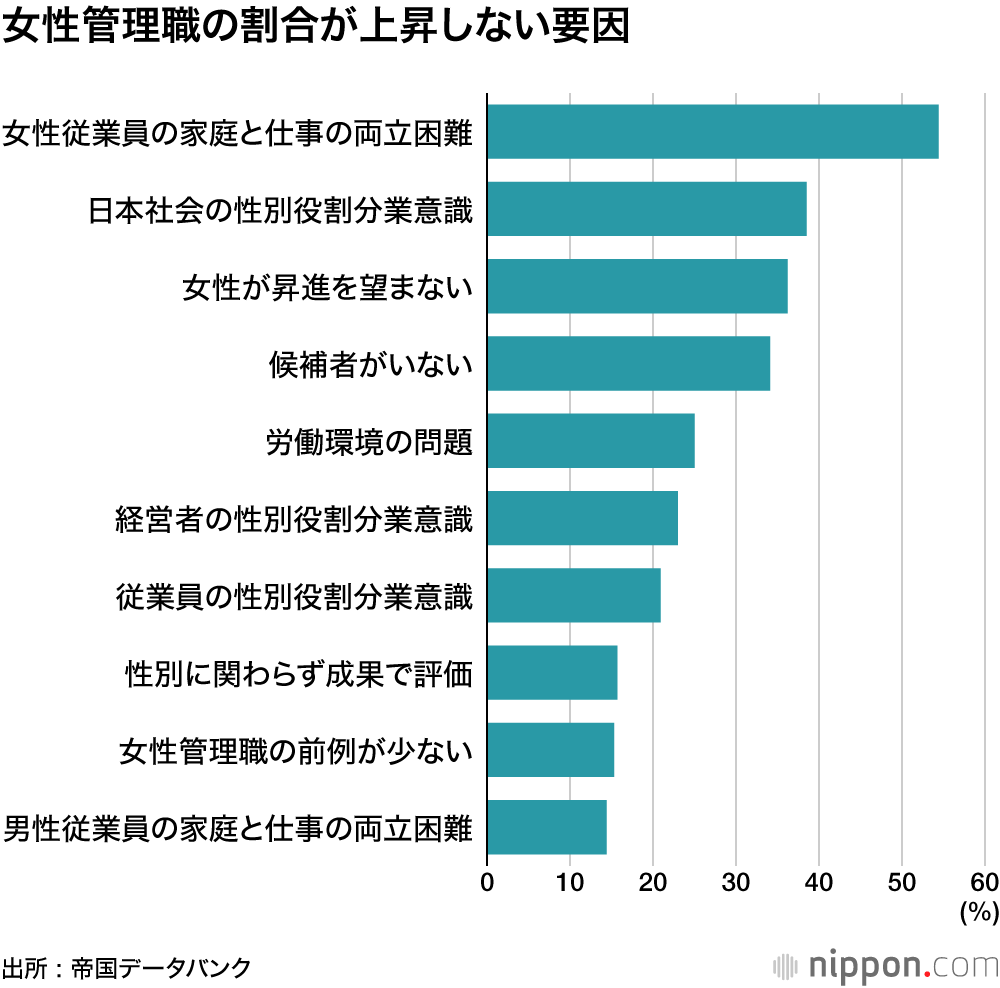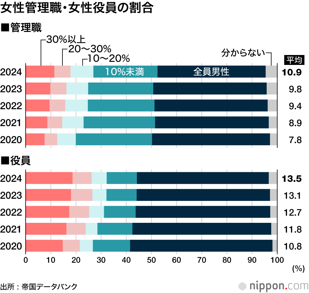 帝国データバンクが2024年7月、全国2万7191社を対象に実施した「企業の女性登用に関する調査」で、女性管理職の割合は前年比1.1ポイント上昇の10.9%となり、同調査を開始した2013年以来、初めて10%を超えた。しかし、「管理職全員男性」企業が43.0%と依然として最多数派で、政府が掲げる「20年代の可能な限り早期に30%程度」の目標には程遠い。世界経済フォーラムのジェンダーギャップ指数、2024年版でも、日本は146カ国中118位と低迷。