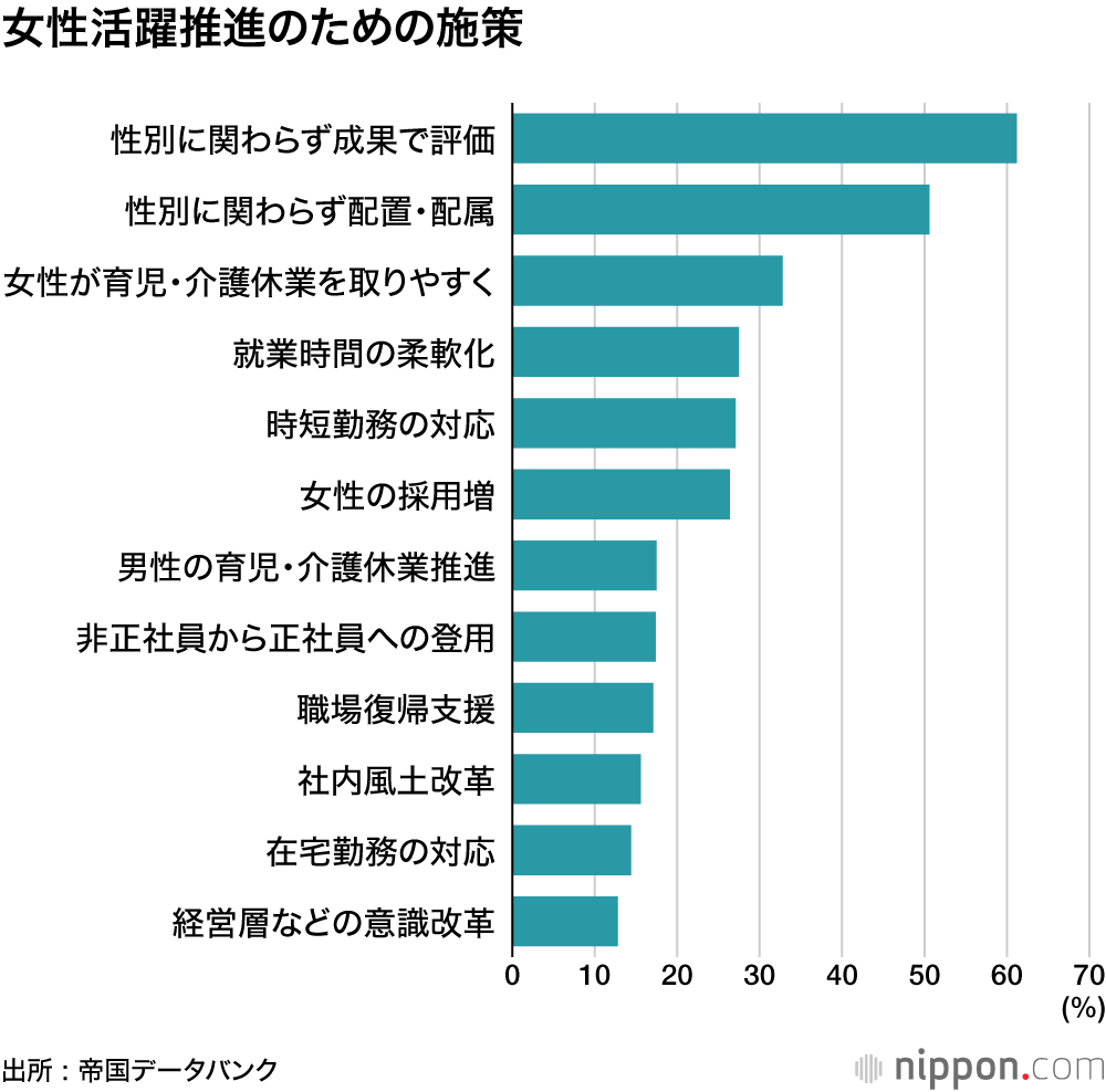女性の活躍推進のための施策としては、「性別に関わらず成果で評価」61.2%がトップ。「性別に関わらず配置・配属」50.6%、「女性が育児・介護休業を取りやすく」32.8%が続いた。男女問わず働き手の家庭と仕事の両立への支援となる「就業時間の柔軟化」27.5%、「時短勤務の対応」27.1%に取り組んでいる企業はそれぞれ4社に1社程度にとどまった。他方、政府が力を入れる「男性の育児・介護休業の推進」は 17.5%で、前年から1.8ポイント上昇した。