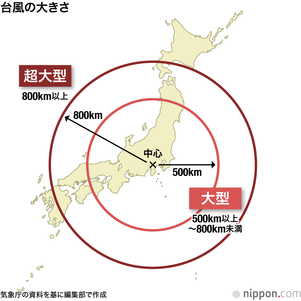 台風の大きさは3段階ある。10分間の平均風速で毎秒15メートル以上の「強風域」の半径が500キロ以上のものを「大型台風」、800キロ以上を「超大型台風」と表現する。