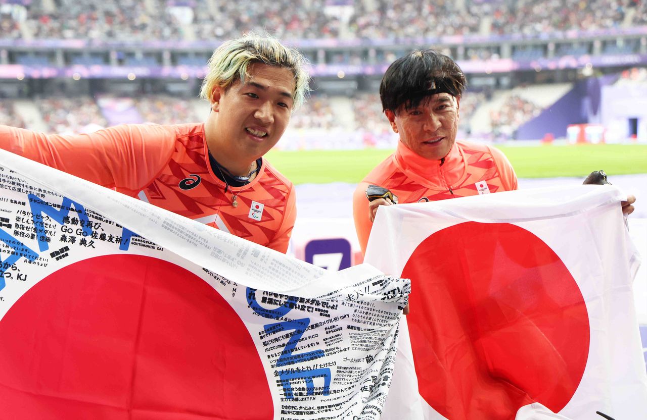 男子400メートル(車いすT52)決勝を終え、日の丸を掲げる銀メダルの佐藤友祈(左)と銅メダルの伊藤智也(時事)