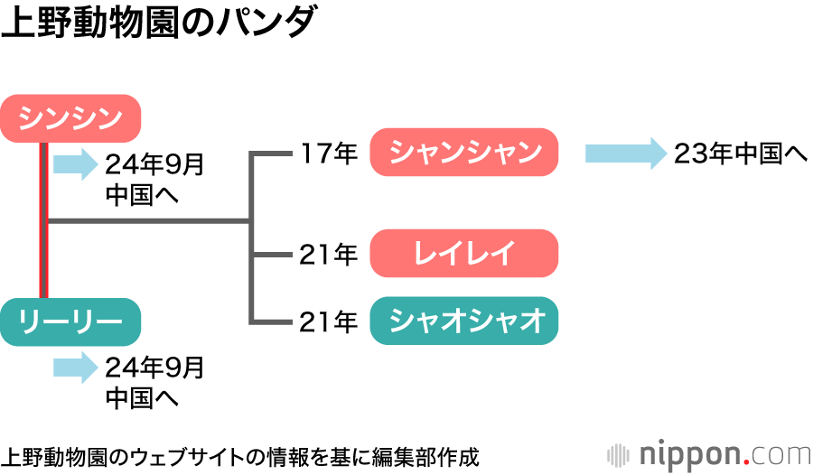 2頭の間には17年にシャンシャン(♀)、21年に双子のレイレイ(♀)とシャオシャオ(♂)と3頭の子どもがいる。シャンシャンは協定に基づいて23年に中国に返還された。シンシンとリーリーが9月に中国に帰ると、残るはレイレイとシャオシャオだけになる。2頭の返還期限は26年2月20日で、あと1年半しかない。