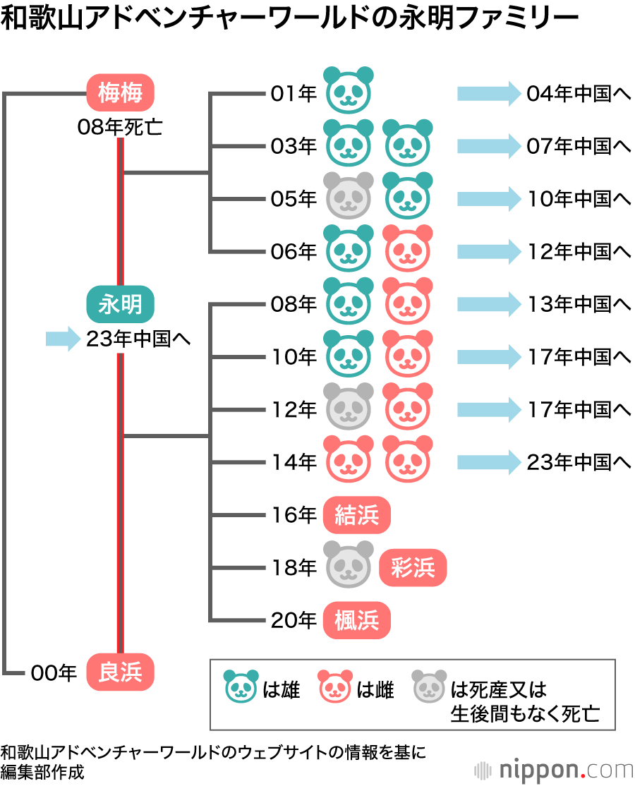 パンダ飼育の成功事例として世界的にも注目されているのは、和歌山県白浜町のテーマパーク「アドベンチャーワールド(AW)」だ。1992年生まれで、2歳の時に日本にやってきた永明(えいめい♂)は2001年以降、ほぼ2年に1回のペースで繁殖に成功し、20年までに16頭のパパとなった。このうち13頭は中国に返還。永明も23年に中国に帰った。