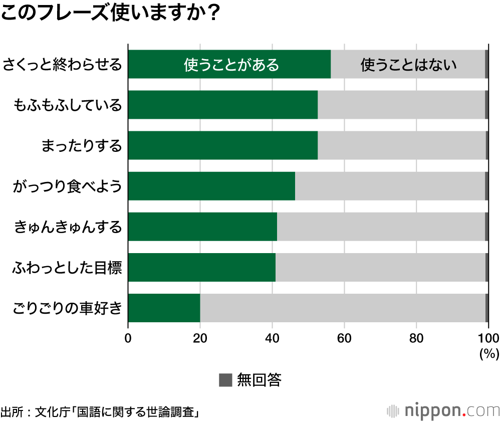 文化庁の2023年度「国語に関する世論調査」では、以下の7種類の新しい擬態語の定着について調査した。