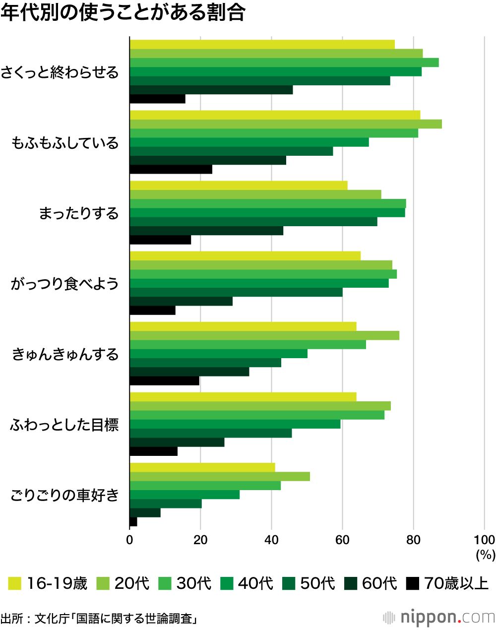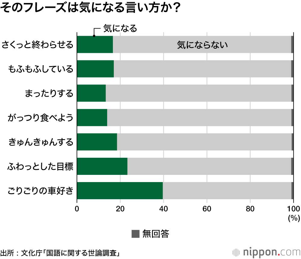 「さくっと」「もふもふ」「まったり」「がっつり」「きゅんきゅん」については、8割超の人が「(他人が使っていても)気にならない」としており、市民権を得た言葉と言えそうだ。
