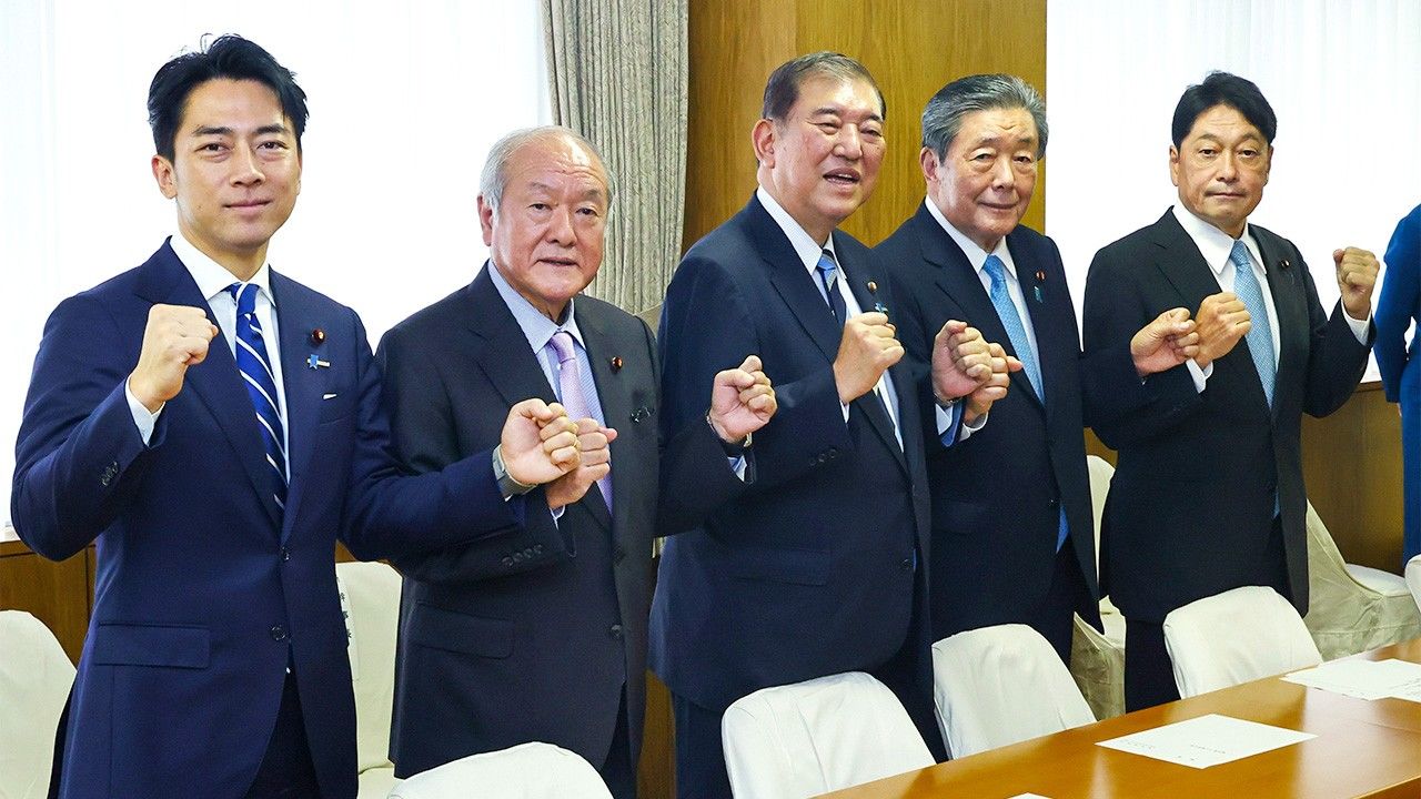 バナー写真 : 左から小泉選対委員長、鈴木総務会長、石破総裁、森山幹事長、小野寺政調会長(時事)