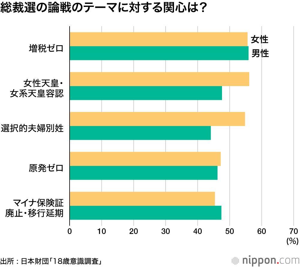 自民党総裁選で候補者が意見を表明して、論戦となったテーマについて関心度を聞いた。「増税ゼロ」については女性・男性ともに55%を超えたが、「女性天皇・女系天皇容認」「選択的夫婦別姓」については、女性の関心度が高く、男性とは開きがあった。