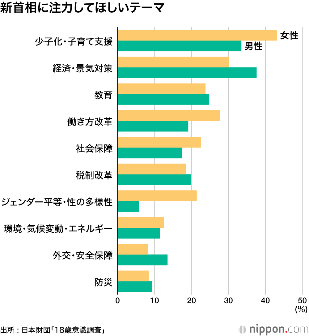 これからの日本の政治で、特に力を入れて取り組んでほしいテーマは、女性は「少子化・子育て支援」が43.1%で最も多く、「経済・景気対策」「働き方改革」が続いた。一方、男性は「経済・景気対策」37.6%がトップで、「少子化・子育て支援」「教育」の順。