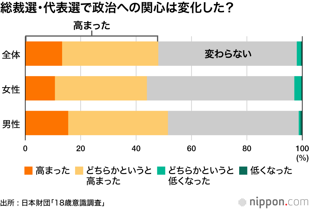日本財団が若者の意見を把握するために継続的に実施している「18歳意識調査」で、自民党総裁選・立憲民主党代表選で政治への関心度合いが変化したかを聞いた。「低くなった」はさすがに少数にとどまったが、「高まった」と「変わらない」は半々だった。