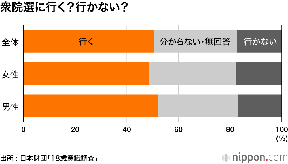 「国民に信を問う」ために実施される衆院選挙について、「行くと思う」は女性48.6%、男性52.2%といずれも約半数にとどまった。