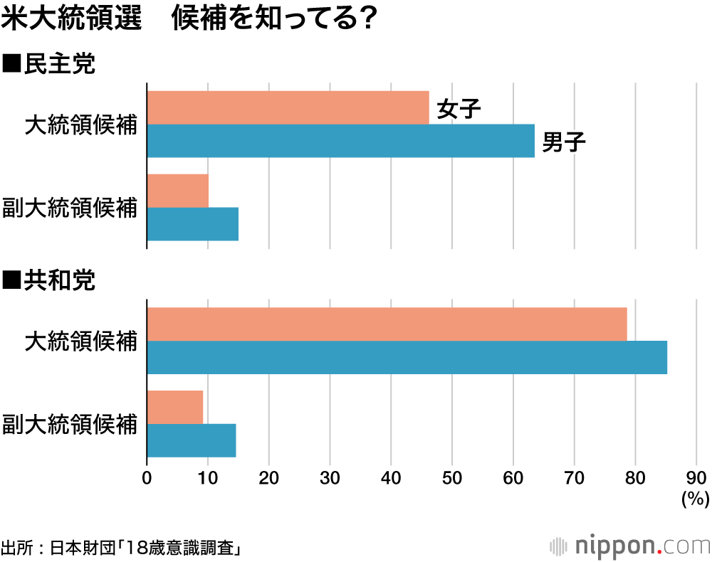 日本財団が若者の意見を把握するために継続的に実施している「18歳意識調査」で、大統領選について聞いたところ、民主党の候補がハリス氏であることを「知っていた」のは全体の約6割。一方、共和党がトランプ氏であることを「知っていた」のは全体の約8割に上った。