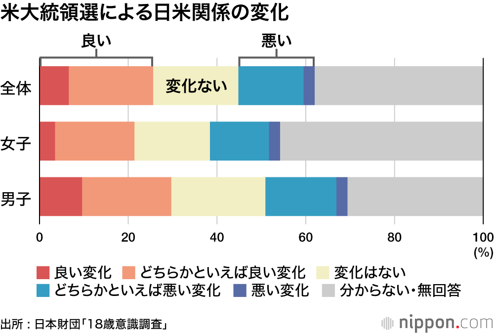 新大統領の誕生で日米関係に「良い変化があると思う」と回答したのは全体で約3割。「変化はない」と「悪い変化がある」との回答がそれぞれ約2割であった。