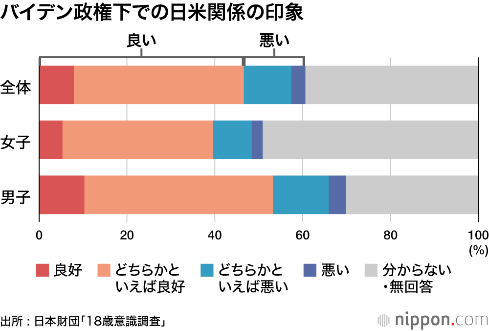 バイデン政権下での日米関係の印象について、「良好」が約5割、「良くなかった」は約1割。「分からない」「回答しない」の合計は約4割に上った。