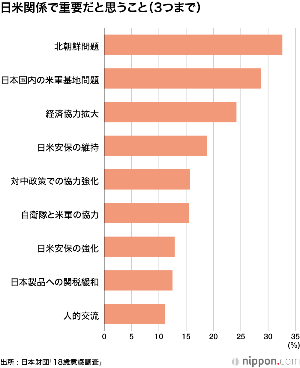 今後の日米関係において重要な取り組みとしては、「北朝鮮問題」を挙げた人が32.6%でトップ。「米軍基地問題」28.7%、「経済協力拡大」24.2%が続いた。「サイバーセキュリティ」「気候変動対策」「人権問題」は1割未満でトップ10圏外だった。