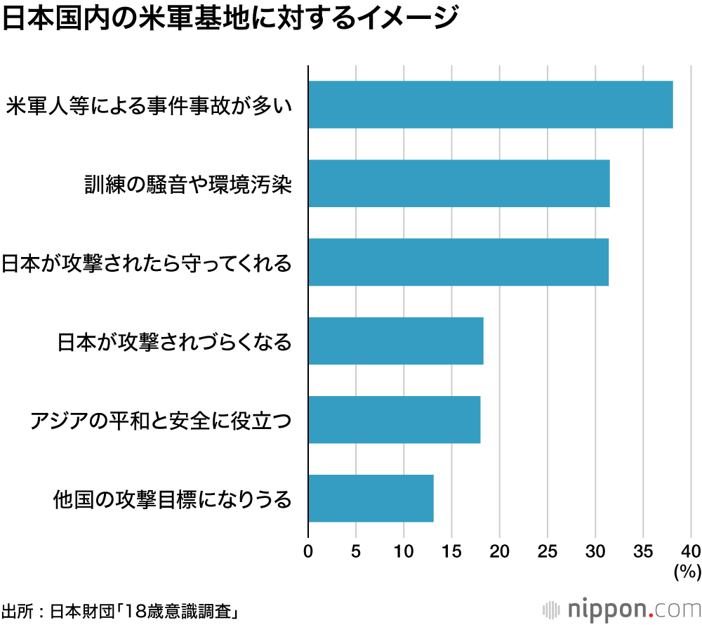 日本国内の米軍基地については、「米軍人等による事件・事故が多い」38.1%で最多。一方、「他国から日本が攻撃・侵略されたら守ってくれる」は31.4%だった。