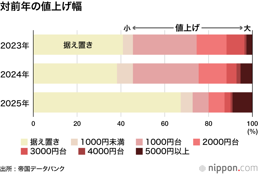 前年から価格が上昇したおせち料理を値上げ幅別にみると、6割超のおせちが「価格据え置き(値下げ含む)」となり、過去3シーズンで最多。大手量販店などでは、売れ筋商品の値下げの動きもあった。