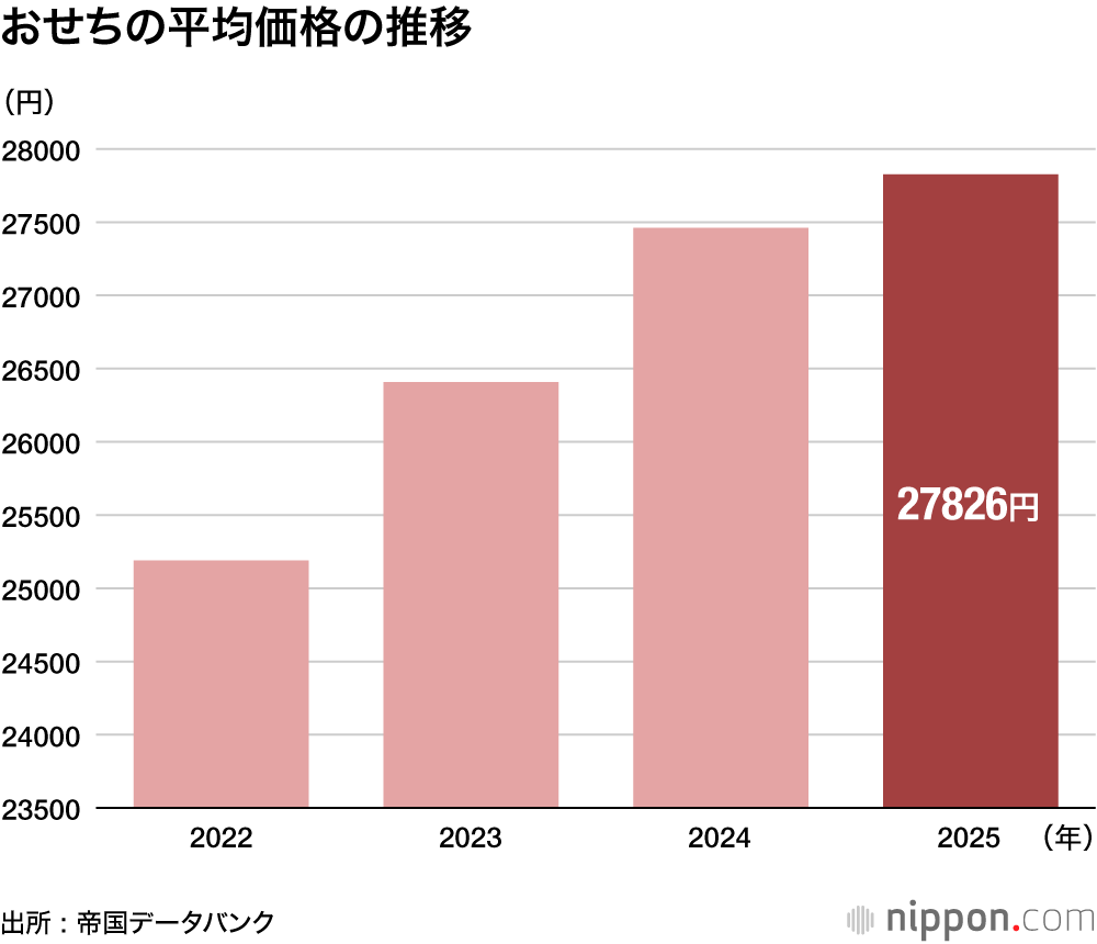 原材料高やエネルギー価格・人件費の高騰を背景に前年(24年正月)は1000円以上の値上がりで2万7466円となった。今年は360円(1.3%)と控えめな値上げにとどまっている。