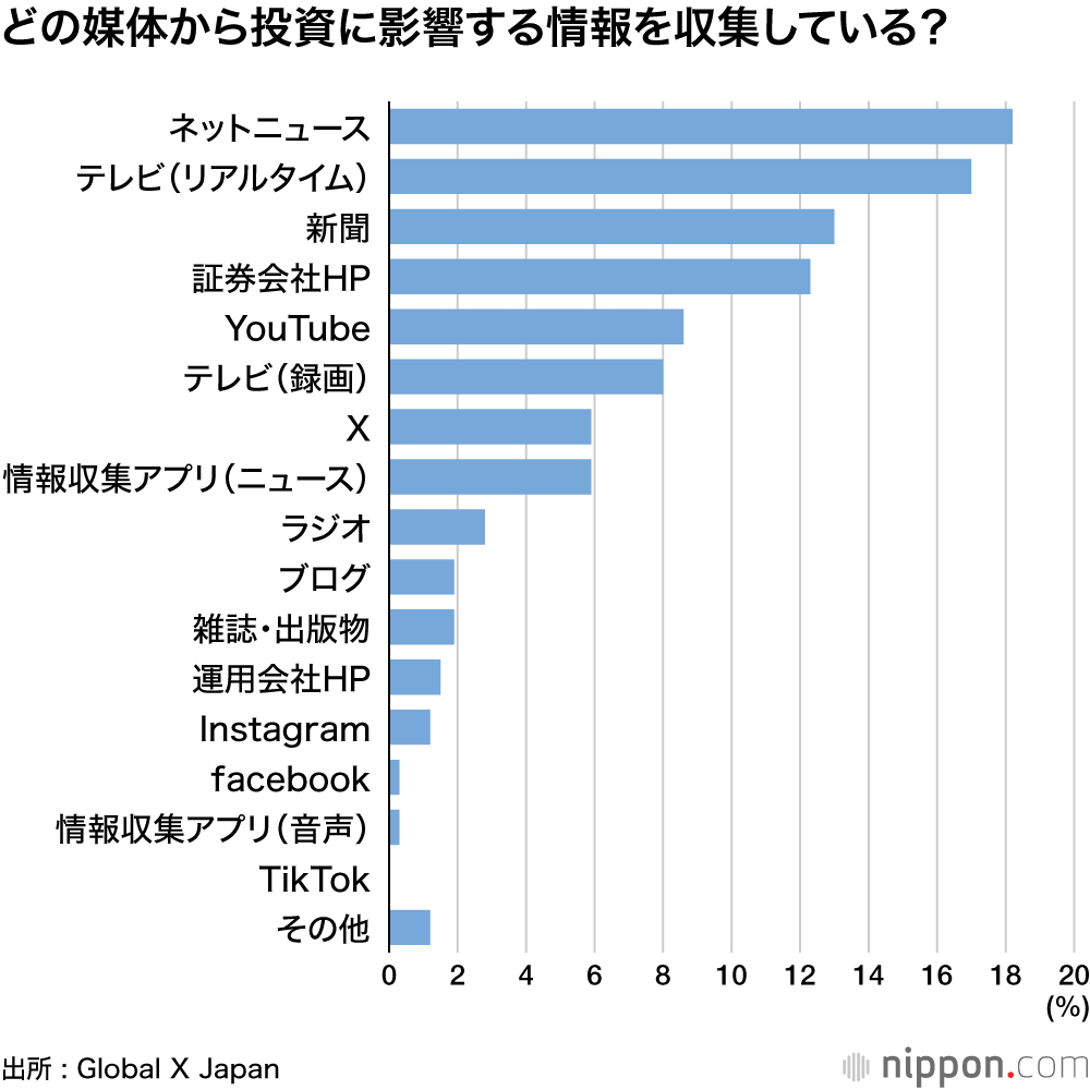 投資に影響する情報収集で最も多く活用する媒体としては、「ネットニュース」18.2%と「テレビ(リアルタイム)」17.0%がきっ抗し、「新聞」13.0%が続いた。投資の中・上級者を対象とした調査で、回答者平均年齢が52.8歳だったことが影響したためか、SNSでの情報収集は相対的に低い結果だった。