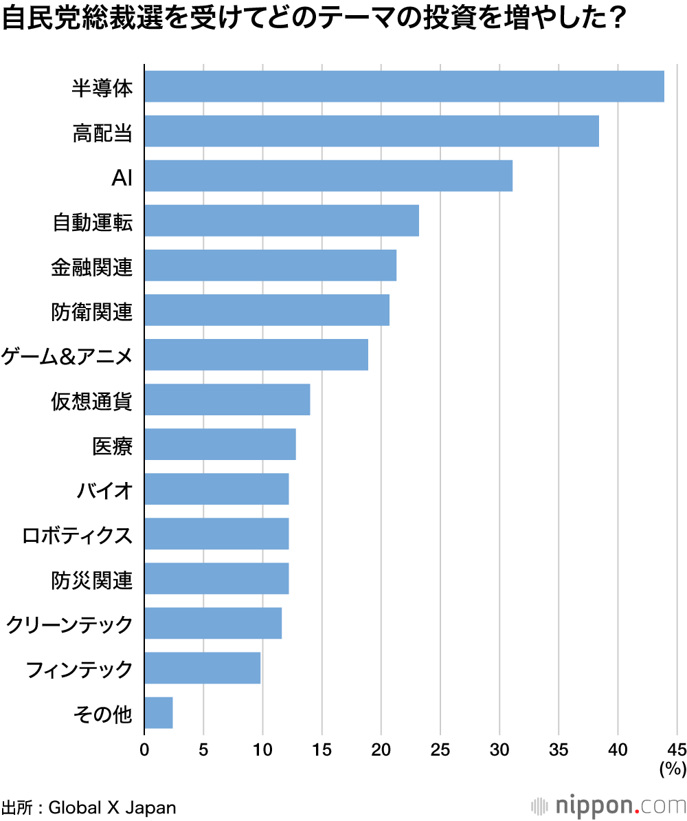 投資商品を「購入した」人に、どのようなテーマの投資を増やしたかを聞いたところ、「半導体」43.9%が最も多く、「高配当」38.4%、「AI」31.1%と続いた。石破政権の注目テーマ「防衛関連」は20.7%だった。