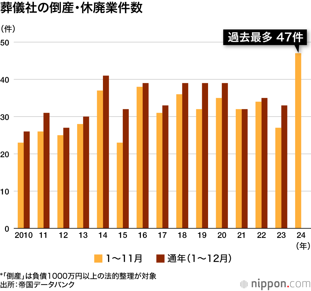 2024年1~11月に発生した葬儀社の倒産(負債1000万円以上の法的整理)は12件、休廃業・解散は35件あり、計47件を記録した。前年同期間に比べ約1.7倍のペースで増えており、通年(1~12月)で過去最多だった07年(42件)を超えている。調査会社の帝国データバンクが発表した。