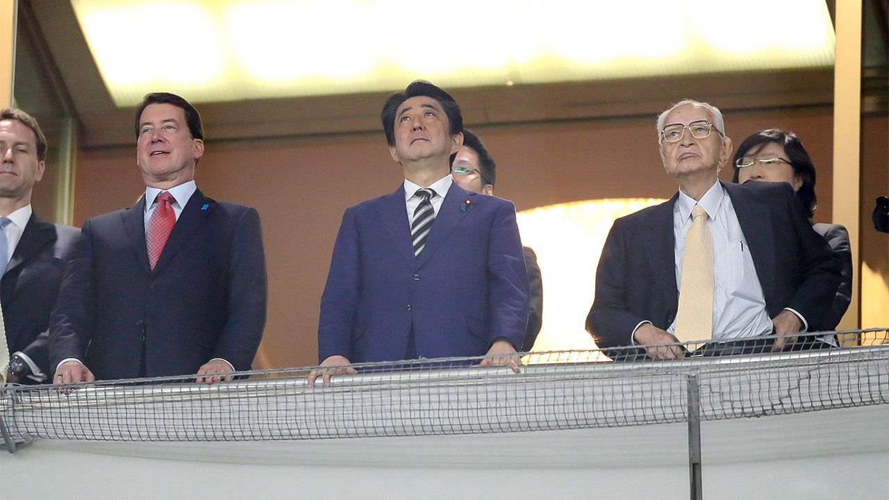 バナー写真:プロ野球開幕戦の巨人-阪神戦を観戦するため、東京ドームを訪れた(左から)ウィリアム・ハガティ駐日米大使、安倍晋三首相、渡辺恒雄読売新聞グループ本社主筆=2018年03月30日、東京都文京区(時事)