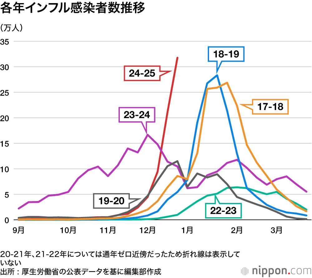 24-25年シーズンは、24年11月に全国的な流行シーズンに入り、12月下旬までの患者数が10週連続で増加している。高齢者や基礎疾患のある人は、鎮痛解熱剤を早めに購入したり、最寄りの発熱外来のある医療機関を調べておいたりするなどの備えをしておきたい。