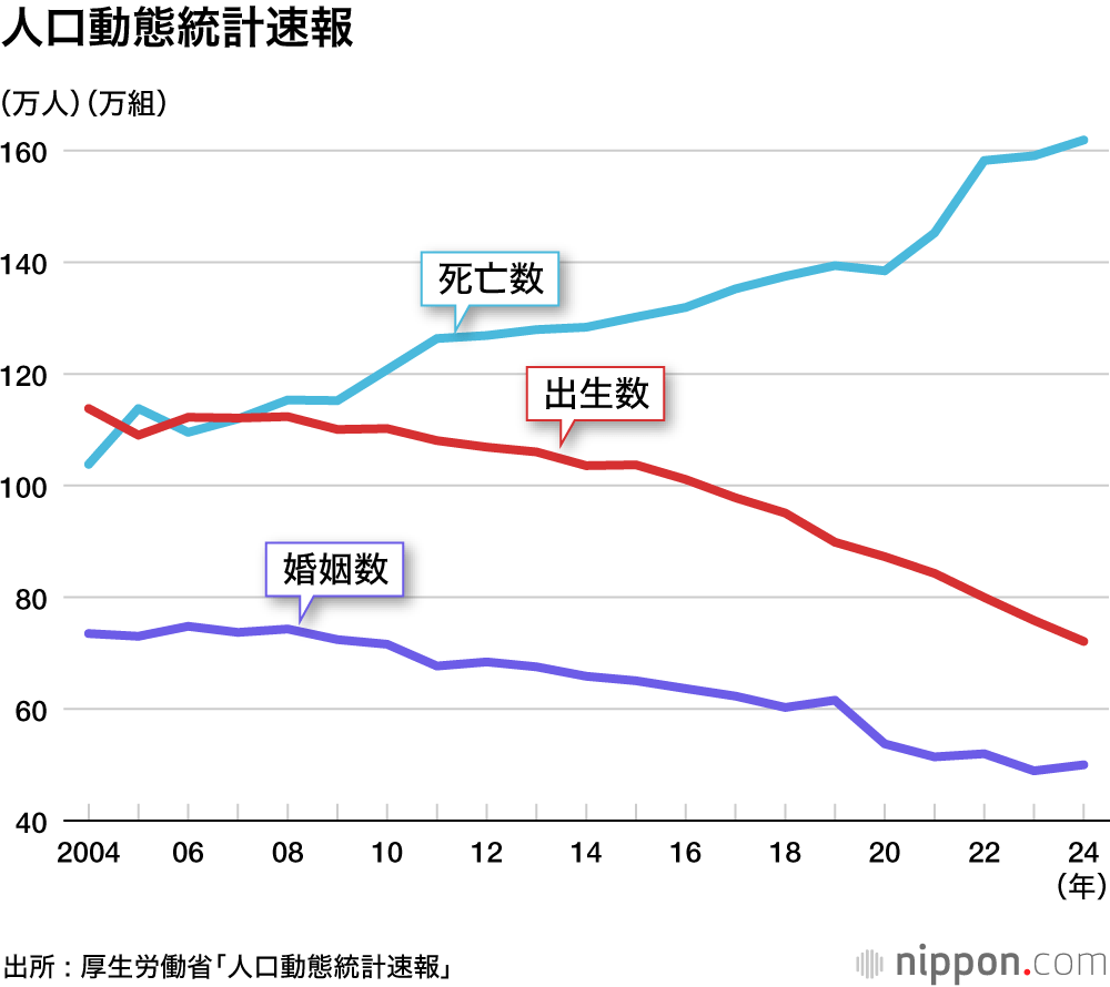 死亡数は前年比2万8181人増の161万8684人で過去最多を記録。人口の自然減(出生数と死亡数の差)は21年に初めて60万人を超えたが、22年は78万2305、23年は83万1872人24年は89万7696人と年を追うごとに人口減に拍車がかかっている。