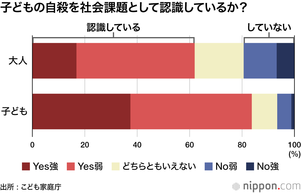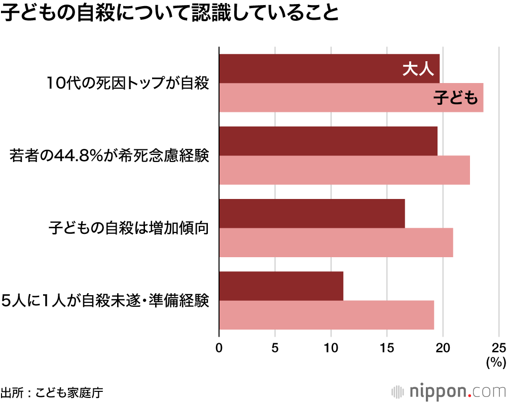 コロナ禍が始まった2020年以降、小中高校生の自殺数が高止まりしている。24年は527人と過去最多だった。こうした状況を受け、こども家庭庁は今年1月、インターネットを通じて「こどもの自殺に関する意識調査」を初めて実施、子ども世代(15~18歳)724人、大人世代(19~59歳)1600人から回答を得た。