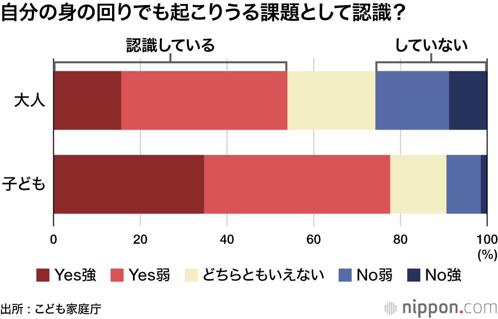 また、子どもの自殺を「自分の周囲でも起こりうる社会課題」として認識しているかについても、子どもは「認識している」77.7%、大人は54.0%と20ポイント以上の差があった。特に、子どもは「強く認識」の割合が高く、身近で切実な問題として捉えていることが分かる。