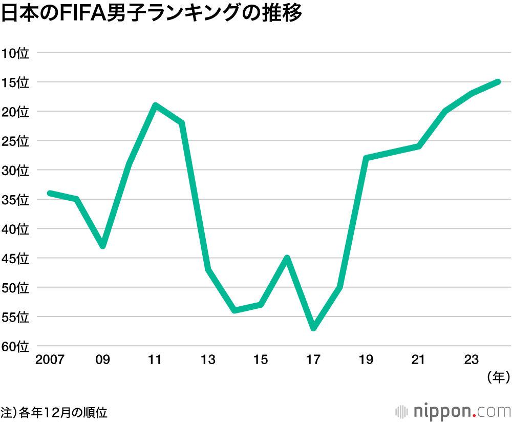 なでしこジャパンは女子ワールドカップの2011年ドイツ大会で、米国を破って初優勝。11年から14年途中まで3位をキープした。12年のロンドン五輪で準優勝、15年のW杯カナダ大会で準優勝を飾ったものの、その後は両大会ともベスト8、ベスト16どまりで、ここ数年はトップ10から外れる期間も多かった。