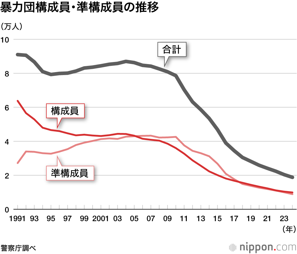 日本の組織犯罪:暴力団勢力は2024年末で過去最少の1万8800人 組員は1万人割れ