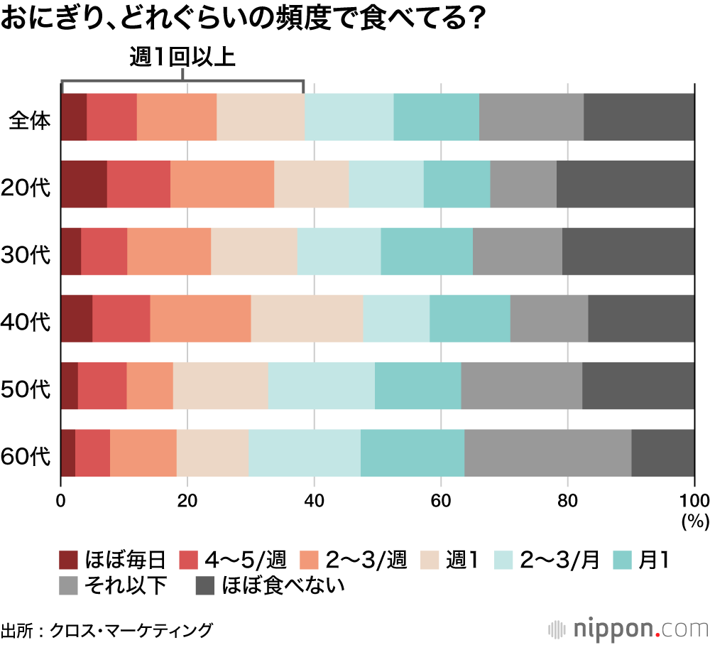 市場調査会社のクロス・マーケティング(東京都新宿区)が全国の20代~60代を対象に実施した調査(有効回答1100サンプル)で、「週1回以上」おにぎりを食べている人は、全体の38.5%だった。年代別では20代が45.5%、40代が47.7%と突出している。「月1回以上」はすべての年代で6割を超えた。