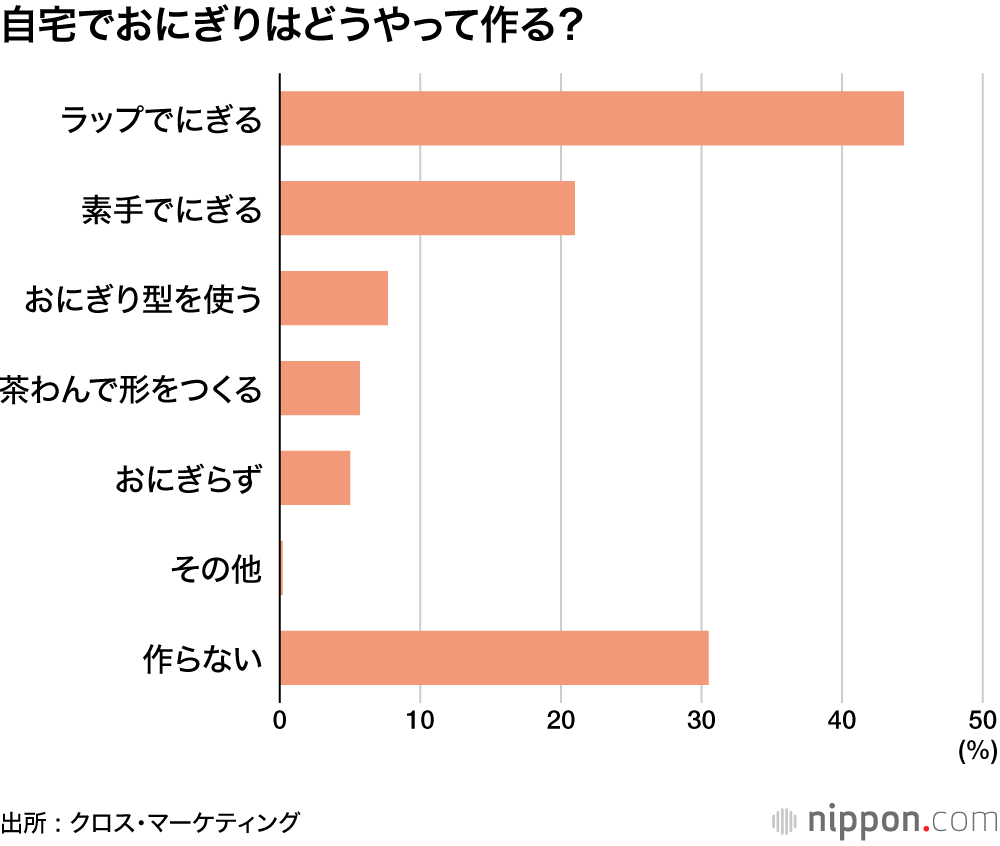 家でおにぎりを作る時には、昭和の時代は水でぬらした手のひらに塩をつけてにぎるのがデフォルトだったが、いまや「ラップでにぎる」が優勢で44.4%。女性では6割がラップ派だった。