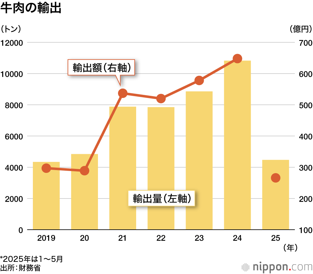 輸出量は24年が前年比22%増の1万826トン、25年1~5月が前年同期比24%増の4469トンだった。