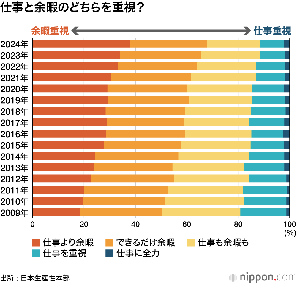 仕事と余暇のどちらに重きを置いているかを聞いた設問で、「仕事よりも余暇の中に生きがいを求める」(37.8%)と「仕事は要領よく片付けて、できるだけ余暇を楽しむ」(30.0%)を合わせた「余暇重視派」は67.8%。比較可能な09年以降で過去最高を更新した。「仕事にも余暇にも同じぐらい力をいれる」は20.7%、「余暇も時には楽しむが、仕事の方に力を注ぐ」は9.3%だった。