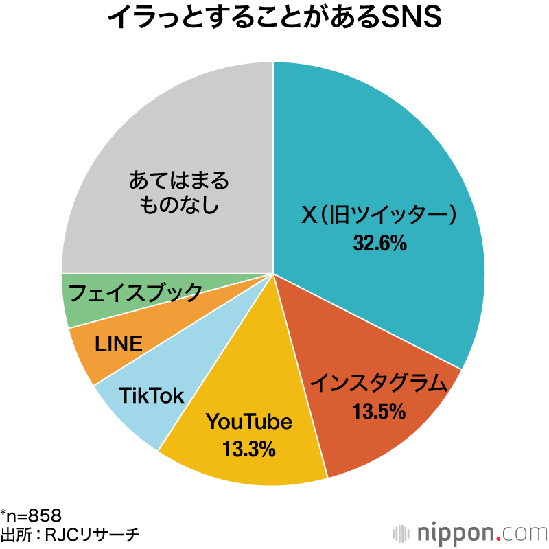 SNSを利用していて腹立ちを感じたことがある人を対象に、最もイラっとするプラットフォームを尋ねたところ、全体の32.6%がXと答えた。2位のインスタグラムとは19.1ポイントの差があった。Xを挙げたのは男女ともに20~30代が多かった。インスタを挙げたのは、女性の20~40代が他の年代よりも多い。