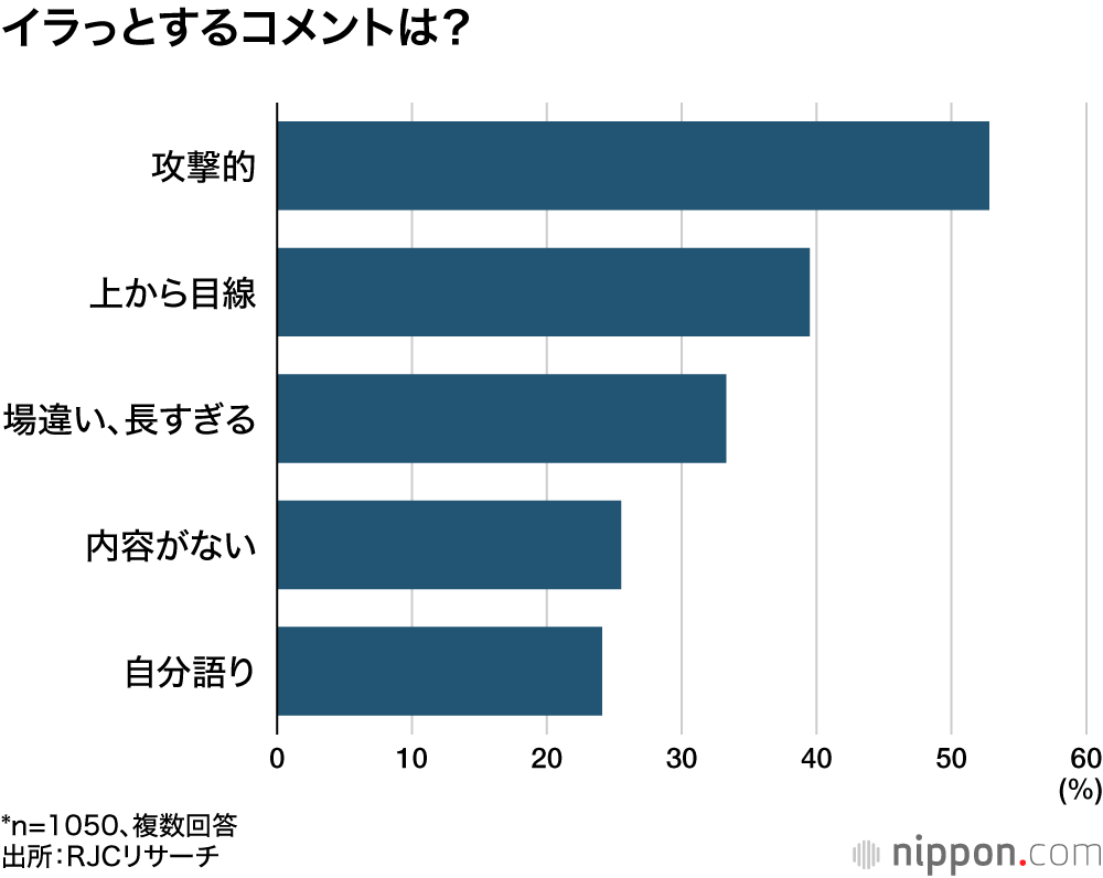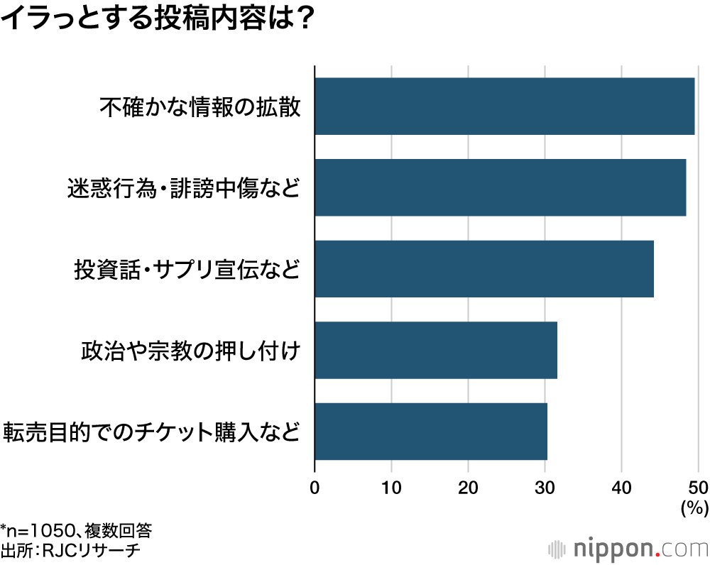イラっとする投稿内容についての質問(複数回答)では、約5割がデマやフェイクニュース、ゴシップなど「不確かな情報の拡散」を挙げ、最多だった。迷惑行為や誹謗(ひぼう)中傷が2位で続いた。コメント、リアクションに関する質問(複数回答)では、「攻撃的なコメント」が最も多く52.8%だった。