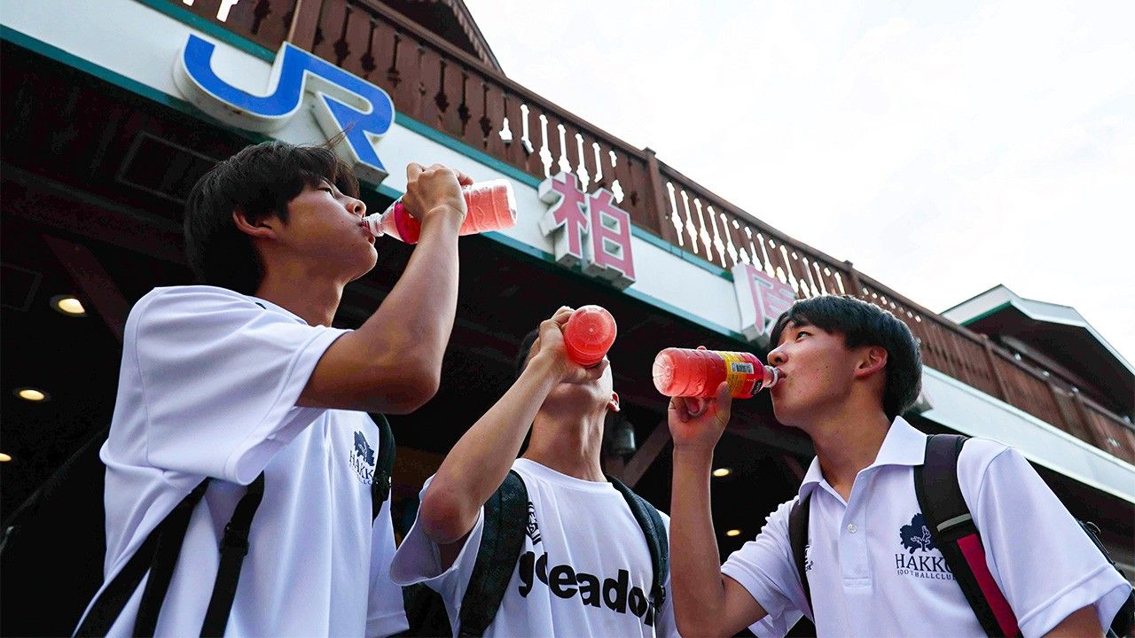 バナー写真 : 国内の観測史上最高気温となる41.2度を記録した兵庫県丹波市のJR柏原駅前で水分補給をする人たち(7月30日午後、時事)