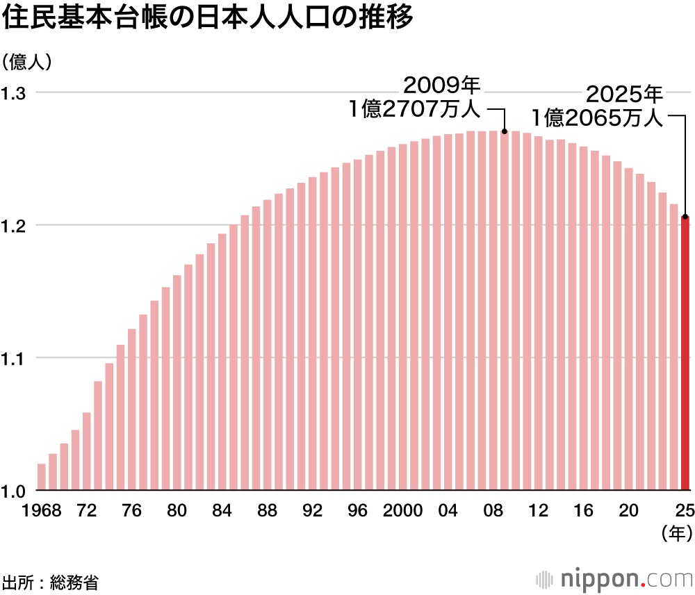 総務省が公表した2025年1月1日時点の住民基本台帳に基づく人口動態調査によると、全国の人口は前年比0.44%減の1億2433万690人だった。
