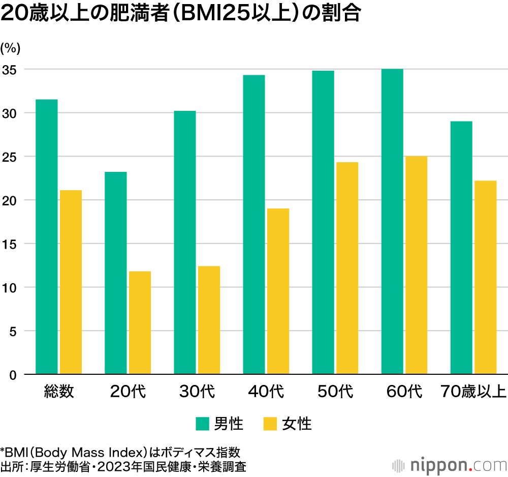 厚生労働省の国民健康・栄養調査(2023年)によると、20歳以上の肥満者(BMI25以上)の割合は男性31.5%、女性21.1%。年を重ねるにつれ割合は上昇し、60代では男性の35%、女性の25%が肥満に分類される。