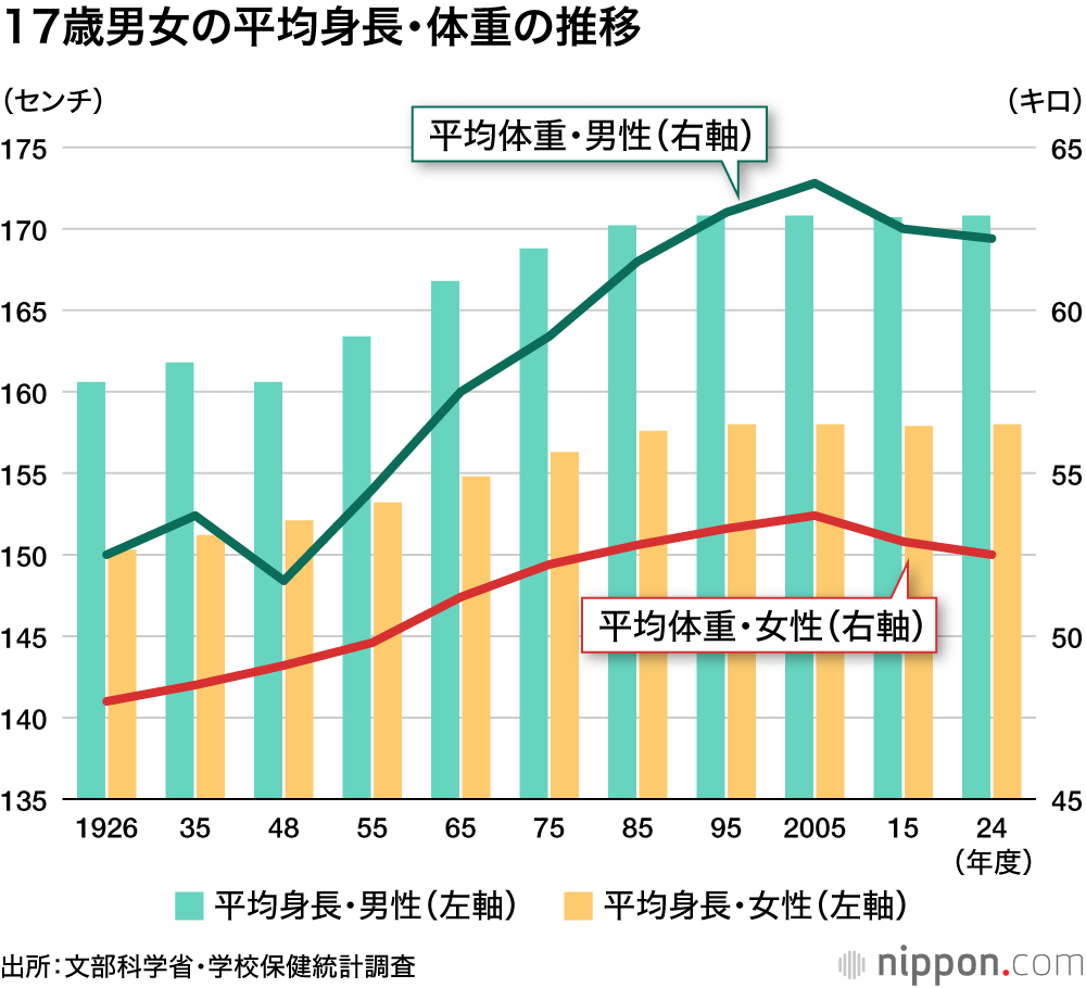 17歳の平均体重は、男性が1926年度が52.5キロ、2024年が62.2キロ、女性のそれは48.0キロと52.5キロ。それぞれ9.7キロ、4.5キロ増えている。