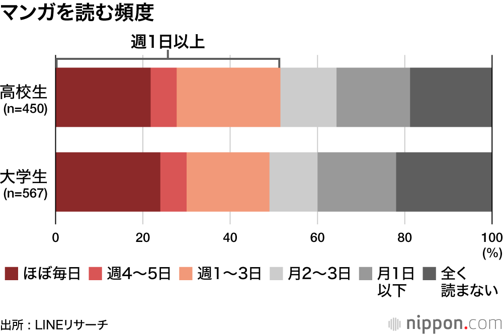 LINEリサーチが8月上旬に全国の15~25歳の学生を対象に実施した調査で、マンガ・コミック・マンガ雑誌など、紙の本や電子書籍をすべて含めて、「週1日以上」マンガを読んでいる高校生は51%、大学生(院生含む)は49%だった。ほぼ半数の学生が週1日以上マンガに接している一方で、「全く読まない」は、高校生19%、大学生22%。