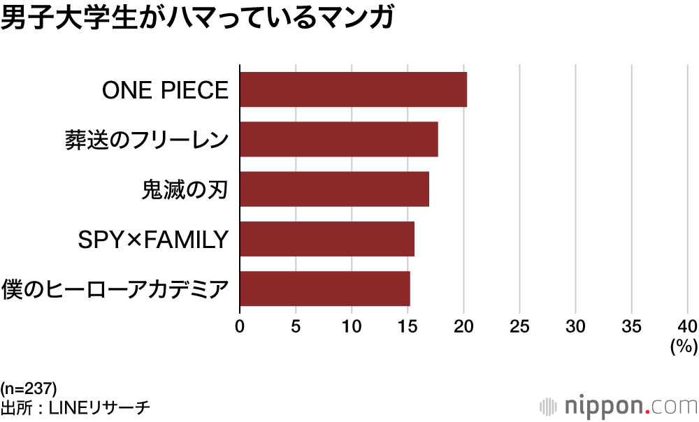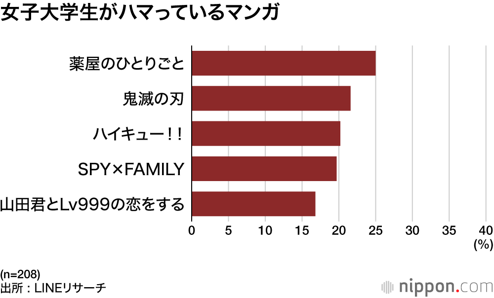 女子大学生は「薬屋のひとりごと」、男子大学生は「ONE PIECE」がそれぞれトップ。「鬼滅の刃」は大学生にも人気で、女子2位、男子3位だった。